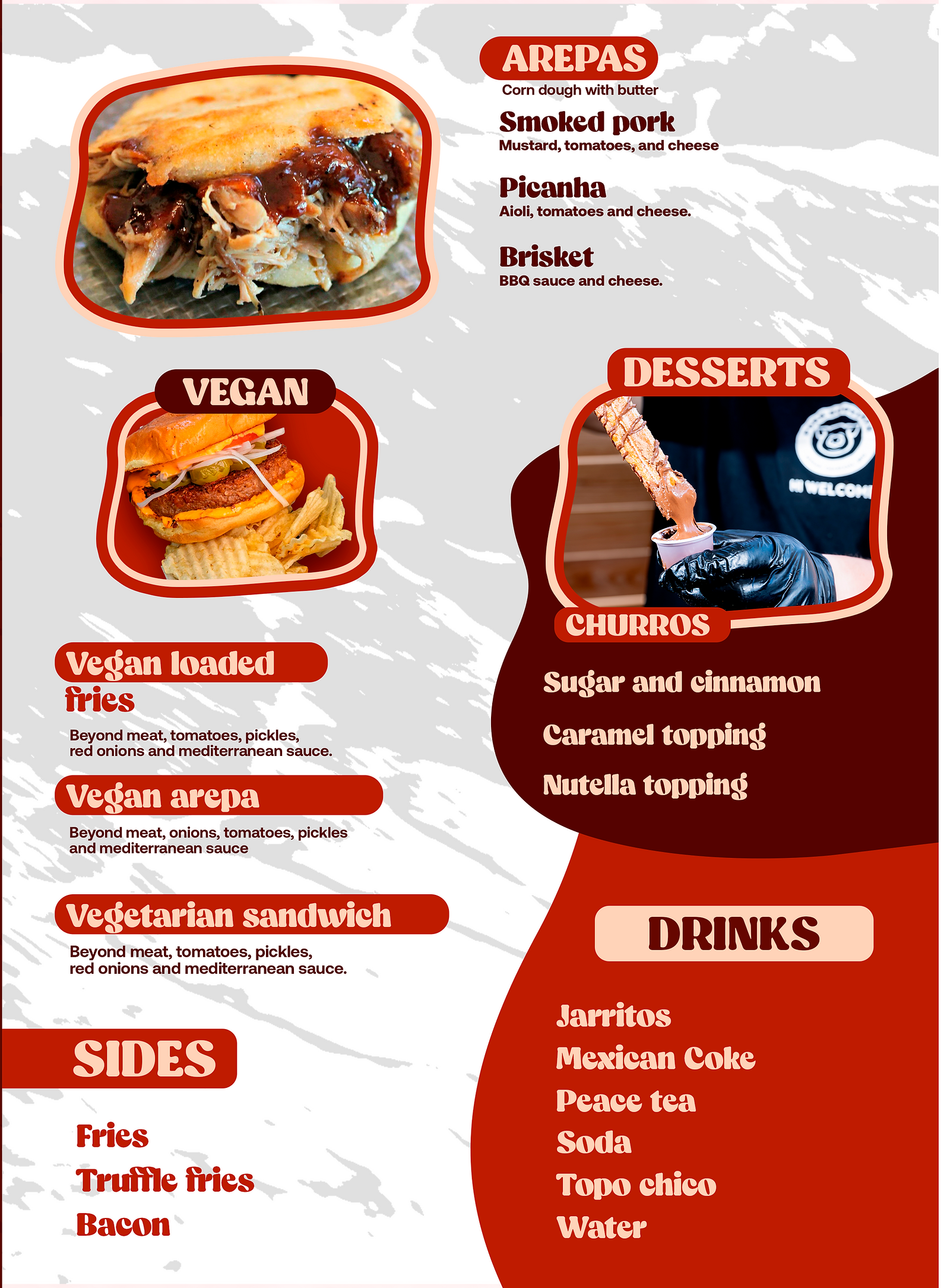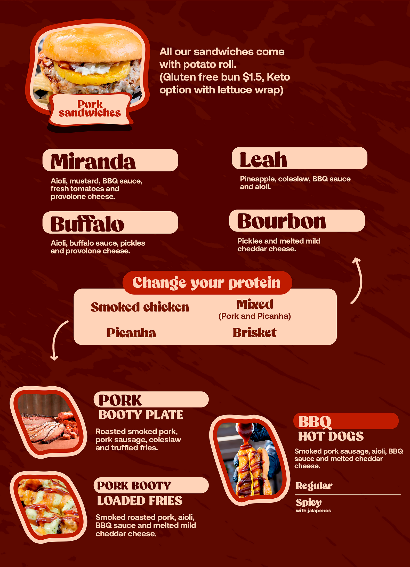 At Pork Booty ATX, we specialize in BBQ with a unique twistâour flavors are a fusion of classic Texas barbecue and our Venezuelan roots. Our signature dish is slow-cooked and roasted pork, prepared over charcoal and wood to achieve a deep, smoky flavor with a perfectly crispy finish. Over time, our menu expanded to include loaded fries and fried arepas, always staying true to the quality and authenticity that define us.